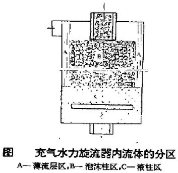 端敞開的透明圓簡(jiǎn))。所以,能正常工作的充氣水力旋流器內(nèi)的流體應(yīng)具薄流層區(qū)、泡沫柱區(qū)和液柱區(qū)三個(gè)區(qū)(上圖),而不是