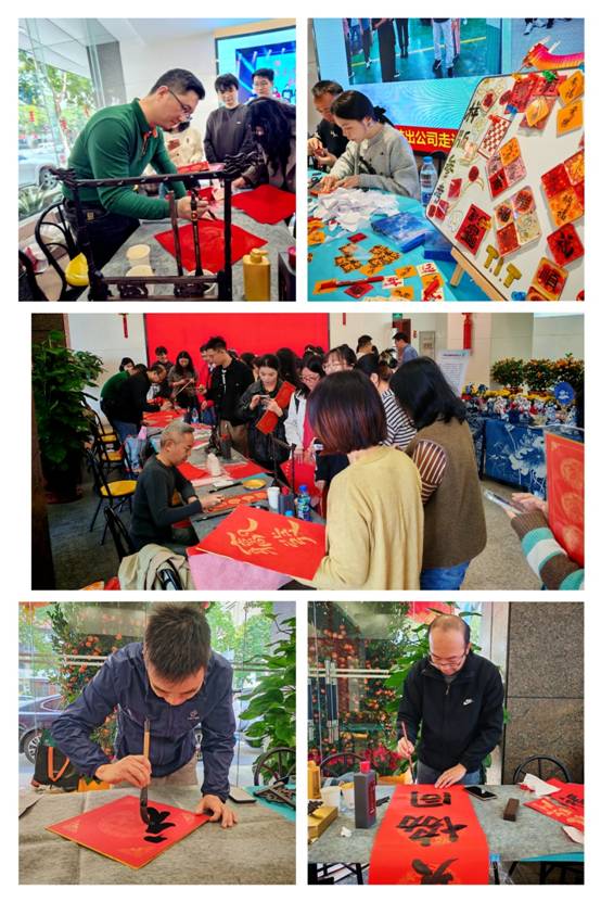 吉祥福手送祝福。在廣德一樓大堂,公司4位書法愛好者張漢彬、李運峰、吳宏景、禤俊峰應邀揮墨送福;設計師黃雨桐巧妙手工制作福字冰箱貼,大堂喜氣洋洋,年味十足,上百名員工參加現場接福活動。福手們凝神靜氣,手腕妙轉,在一張張紅紙上揮灑自如地書寫“福”字和各式吉祥春聯,一個個蒼勁有力或流暢飄逸或趣味可愛的“福”傳遞到接福的同事們手上,大家眉開眼笑,幸福綻放。這一傳統習俗承載公司對廣大員工的新年美好祈愿與祝福,場景溫馨而充滿喜悅。活動現場共送出500多份福字作品。