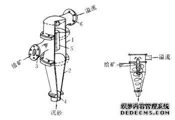 水力旋流器結(jié)構(gòu):水力旋流器上部是一個中空的圓柱體,下部是一個與圓柱體相通的倒錐體,二者組成水力旋流器的作業(yè)簡體。圓柱形筒體上端切向裝有給礦管,頂部裝有溢流管及溢流導(dǎo)管。在圓錐形筒體底部有沉砂口。各部分之間用法蘭盤及螺釘銜接。給礦口、筒體和沉砂口一般襯有橡膠、聚氨酯、碳化硅或輝綠巖鑄石,以便減少磨損并在磨損后更換。