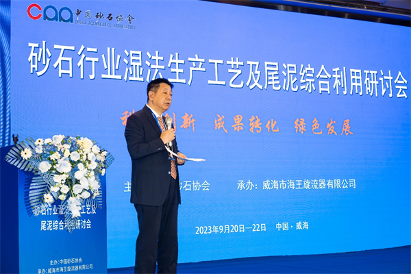 2023年9月20-22日,由中國(guó)砂石協(xié)會(huì)主辦、威海市海王旋流器有限公司承辦的“砂石行業(yè)濕法生產(chǎn)工藝及尾泥綜合利用研討會(huì)”在山東威海隆重召開。本次會(huì)議以“科技創(chuàng)新、成果轉(zhuǎn)化、綠色發(fā)展”為主題,來自全國(guó)砂石及相關(guān)行業(yè)專家、企業(yè)領(lǐng)導(dǎo)代表,媒體代表等逾300人參會(huì)。會(huì)議同期舉辦了海王“低模數(shù)粒料逆流洗砂裝備與工藝研發(fā)”科技成果評(píng)價(jià)會(huì),“高精度逆流洗砂技術(shù)裝備下線儀式暨洗砂裝備戰(zhàn)略合作簽約儀式”。